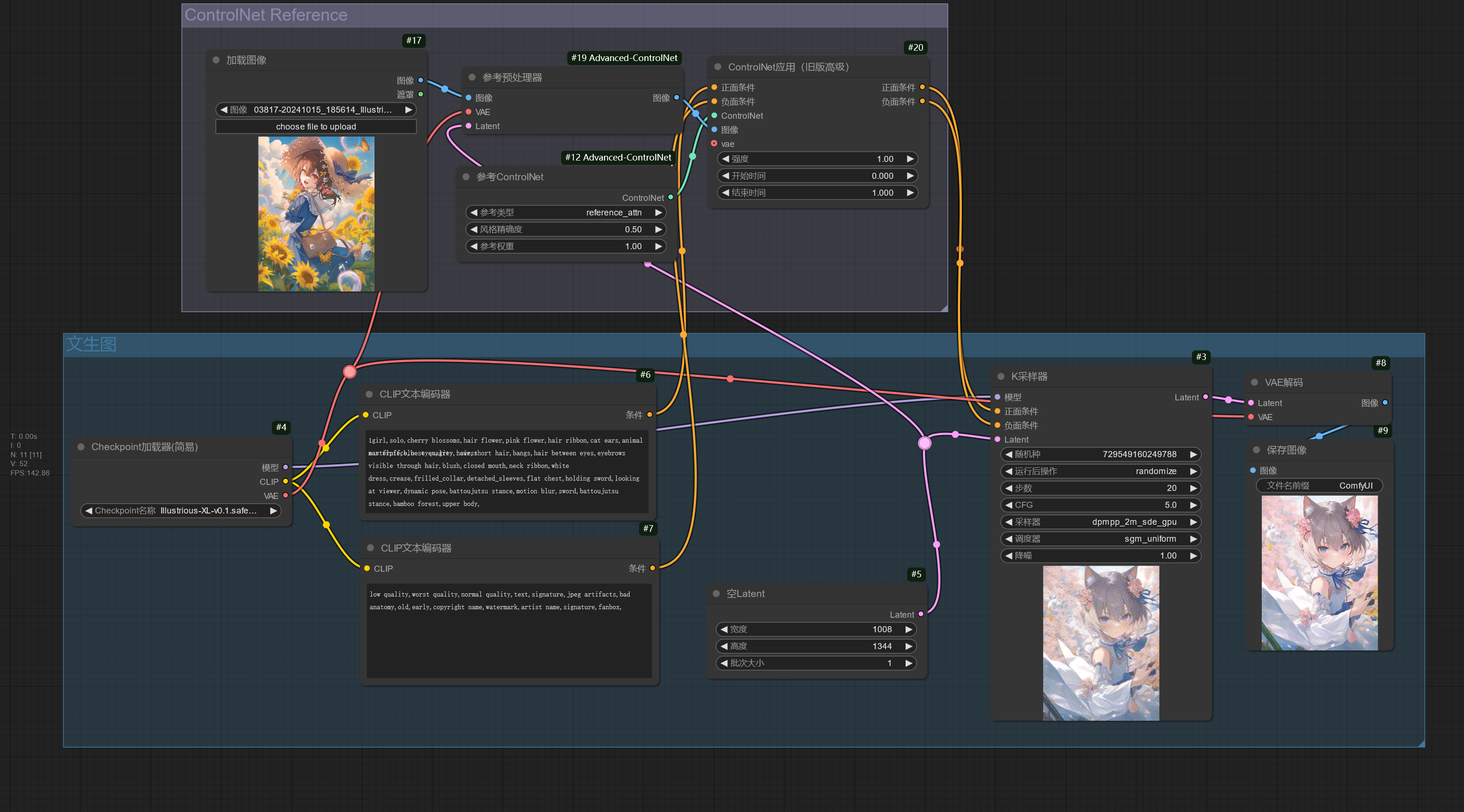 ControlNet Reference 无法通过 ComfyUI 内置节点实现,但是 ComfyUI-Advanced-ControlNet 扩展提供了相关的节点,下面是搭建 ControlNet Reference 的工作流。