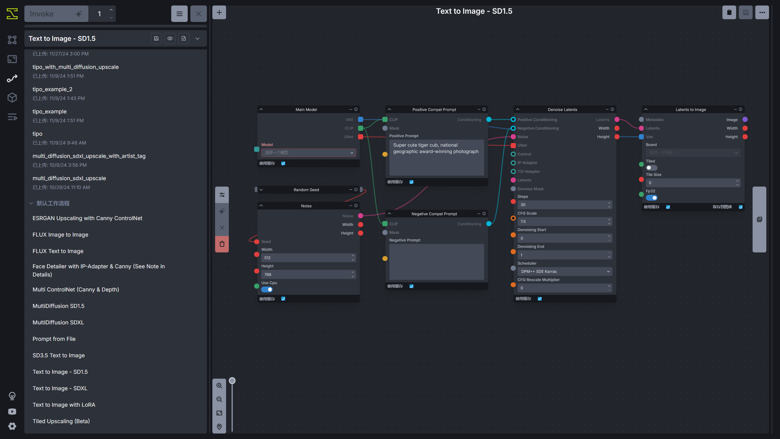 InvokeAI 除了提供统一画布进行图片创作,还提供了类似 ComfyUI 的工作流系统进行图片创作。