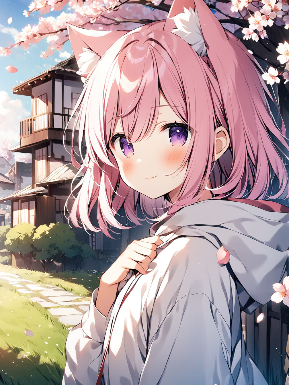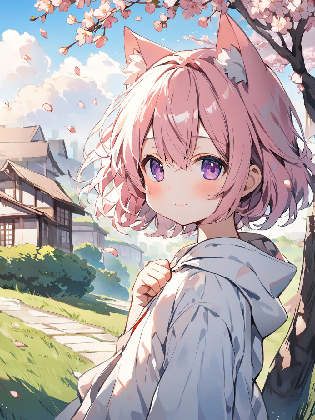 1girl,animal ears,animal ear fluff,cat ears,pink hair,short hair,bangs,blush,closed mouth,light smile,purple eyes,hair between eyes,white hoodie,flat chest,