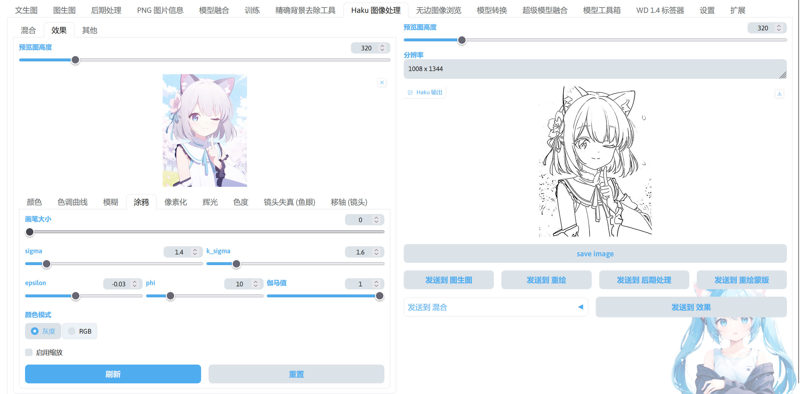 a1111-sd-webui-haku-img 扩展可对图像进行一些处理,如提取图片线稿,图片像素化等。