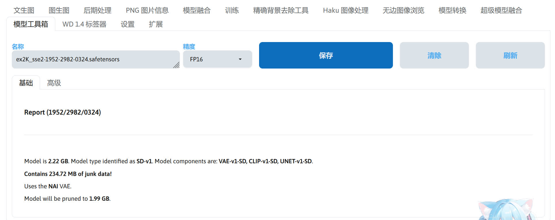 SD 1.5 的模型用于生图时只有 2 GB 是有效的数据,但是有许多 SD 1.5 的模型的大小超过了 2 GB。可以通过 stable-diffusion-webui-model-toolkit 扩展查看模型是否有垃圾数据存在。