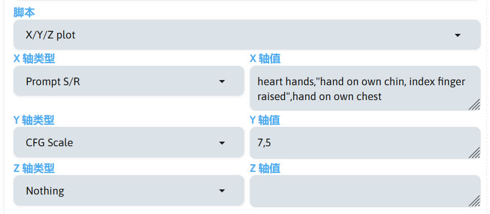 Prompr S/R 为提示词替换,这里我填的是heart hands,"hand on own chin, index finger raised",hand on own chest,SD WebUI 将第一个逗号前的提示词作为被替换的对象(也就是heart hands),生图时将所写的完整提示词中的heart hands替换成heart hands、hand on own chin, index finger raised、hand on own chest。