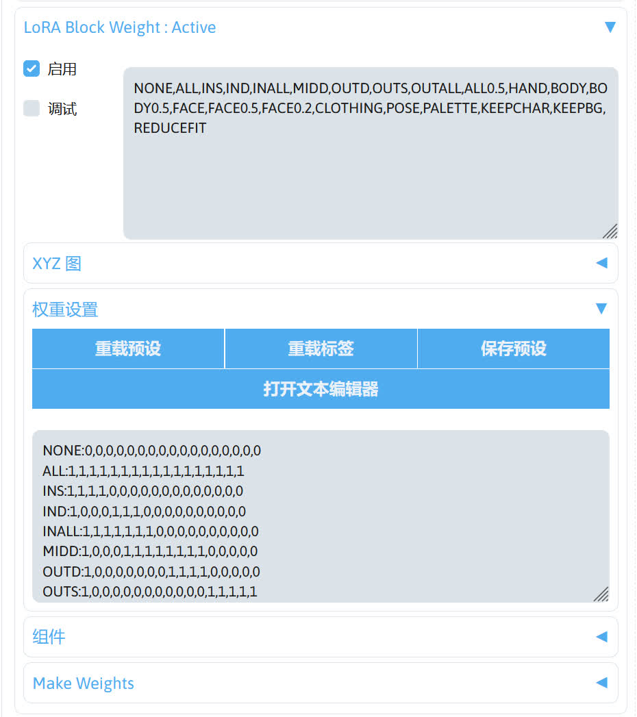 具体的权重如何调需要自己实践得出,因为不同的 LoRA 模型需要的分层权重不一定相同。