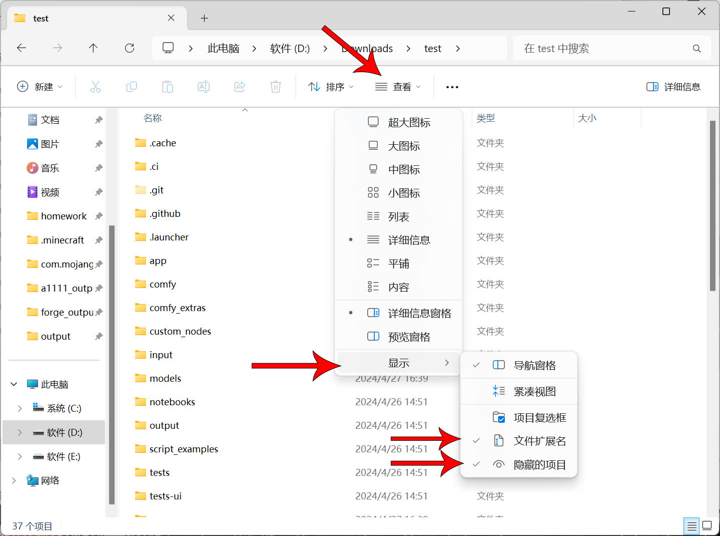 在文件管理器中点击查看->显示,勾选文件扩展名和隐藏的项目。