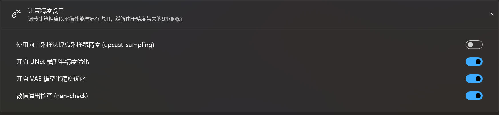 数据溢出检查用于检测是否出现 NaN,如果想禁用 NaN 提示,可选择关闭该选项,这样即使偶尔出现 NaN 时也不会中断生图(这时会直接输出一张黑图)。