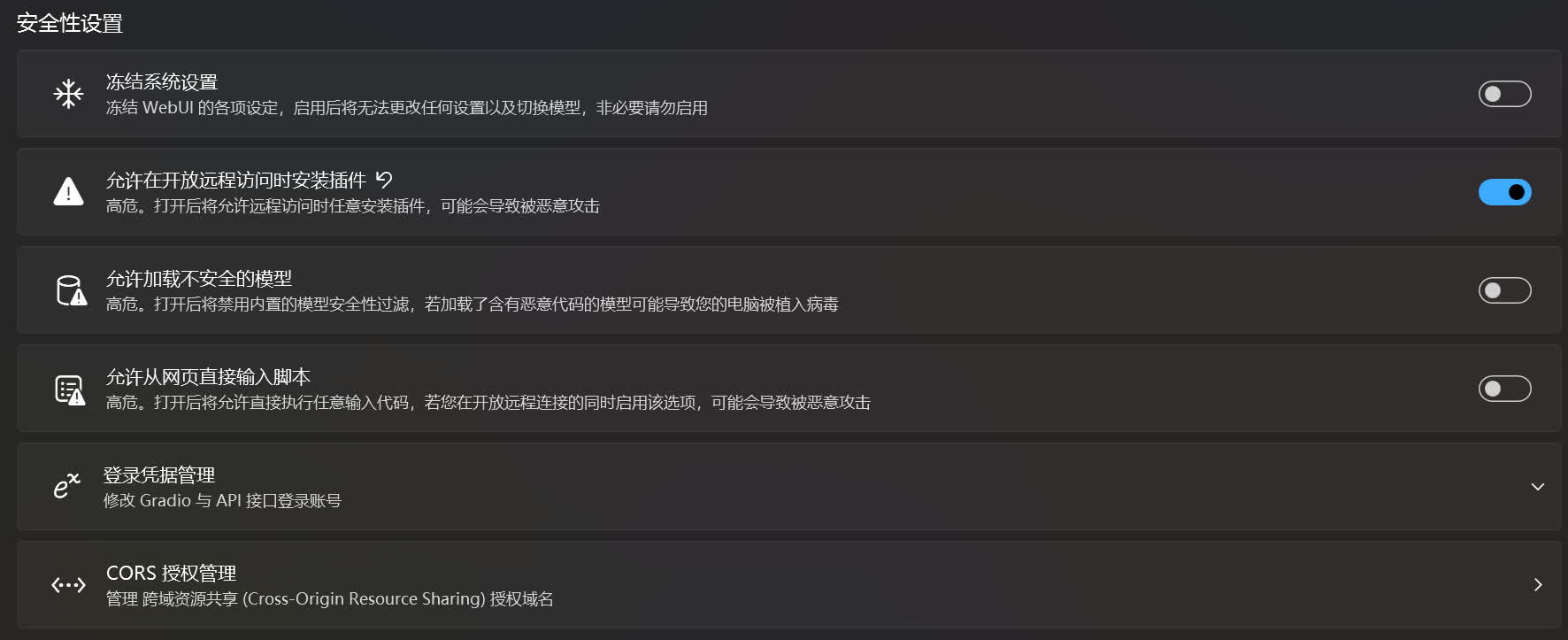--enable-insecure-extension-access - (启用时) SD WebUI Forge: